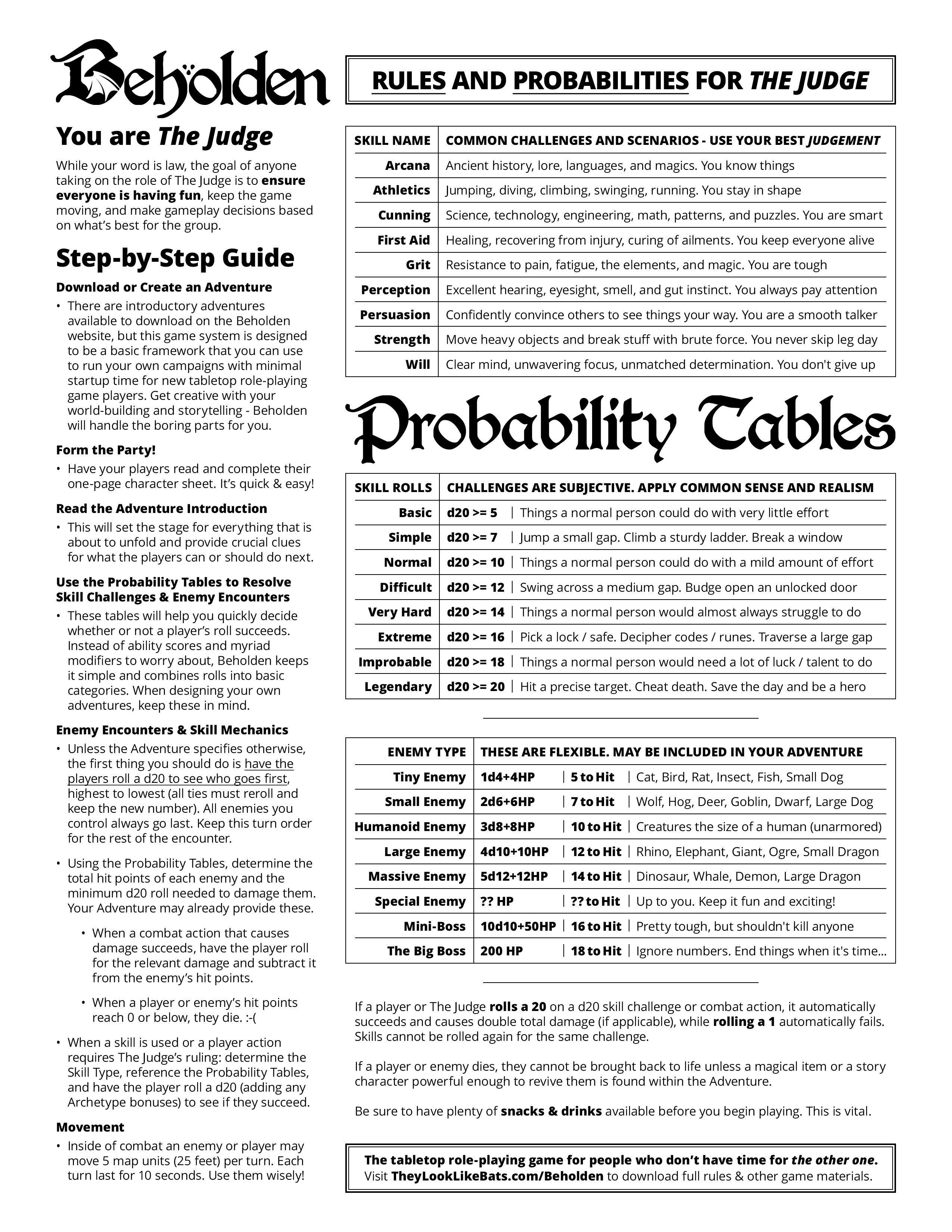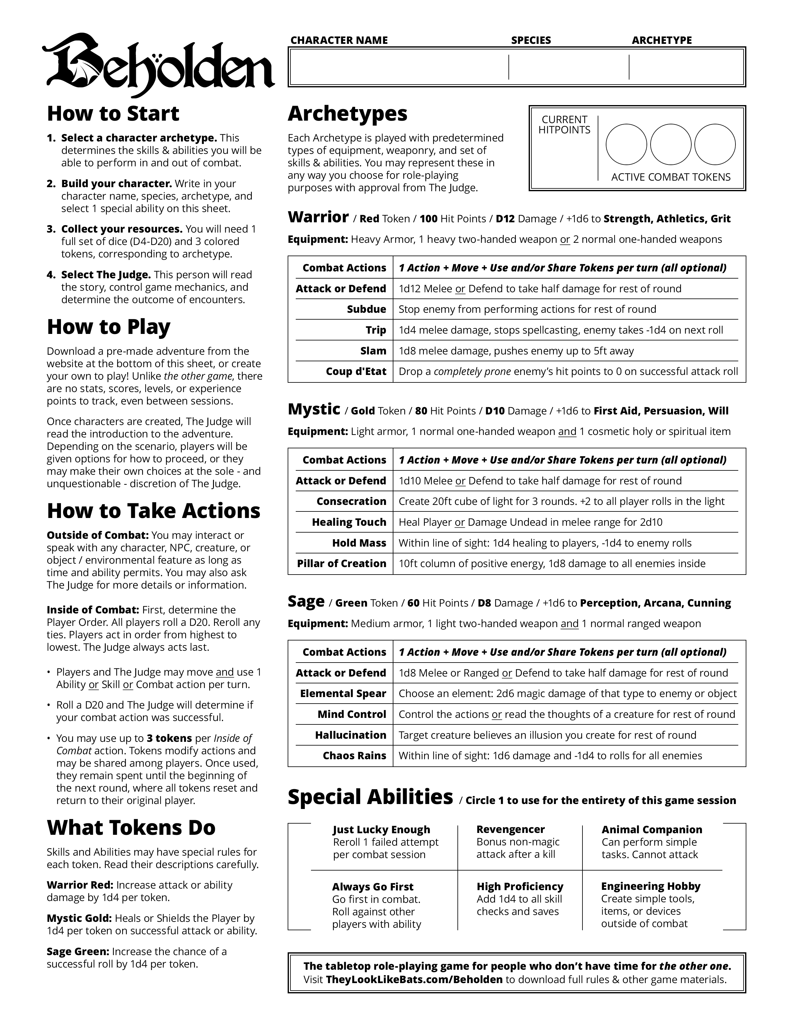Below you’ll find everything you need to begin your first session of Beholden in just a few minutes. That’s because Beholden doesn’t rely on countless handbooks, guides, or tedious reference manuals. The goal is to get both new and experienced players into the game – and having fun – as quickly as possible. Never lose an entire night to character creation ever again!